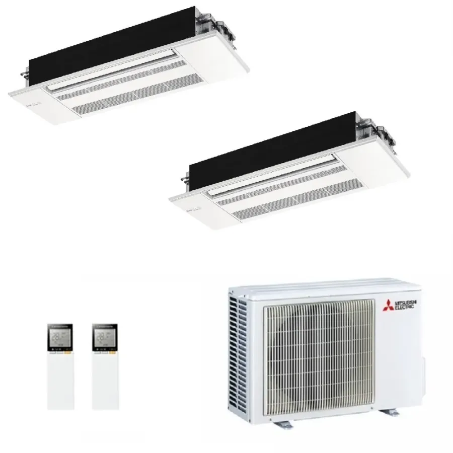 Klimaanlagen Mitsubishi Duo Split Serie MLZ-KP WiFi Optional 9000+12000 Btu Inneneinheit für Mitsubishi-Klimaanlagen Mono Split- und Multi Split-Konfiguration mit Heiz- und Kühlmodus. Kassetten-Klimagerät MLZ-KP mit 1 Ausgang, hervorragend geeignet für eine Direktströmung oder kleine und beengte Räume.