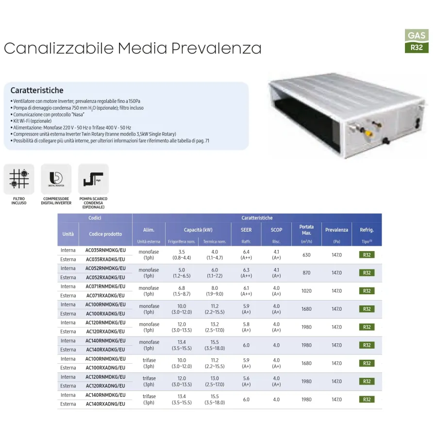 - Lüfter mit Invertermotor; einstellbare Prävalenz bis 150Pa- Kondensatablasspumpe 750 mm H2O (optional); Filter enthalten