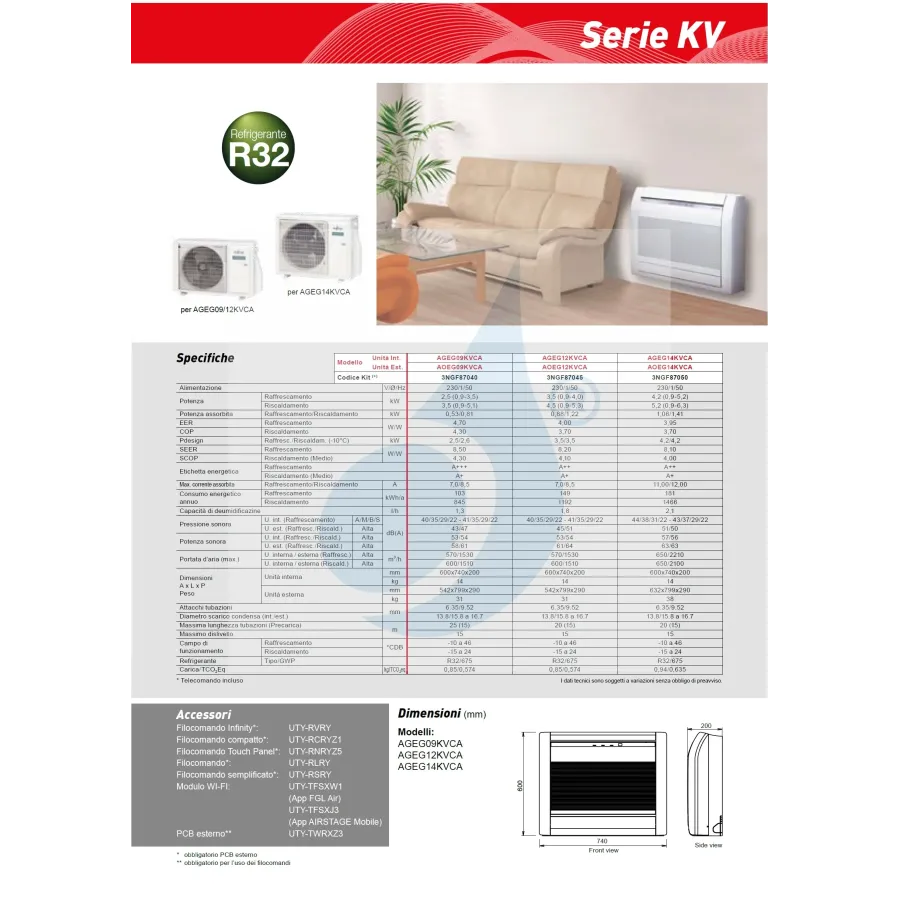 Klimaanlagen Fujitsu Mono Split Serie Fußboden KV WiFi Optional 14000 Btu Heizung mit Wärmepumpe mit Niedrigenergieverbrauch Invertertechnologie ideal für Dachböden oder Installationen unter Fenstern, optimal zum Heizen durch die Position in Bodennähe