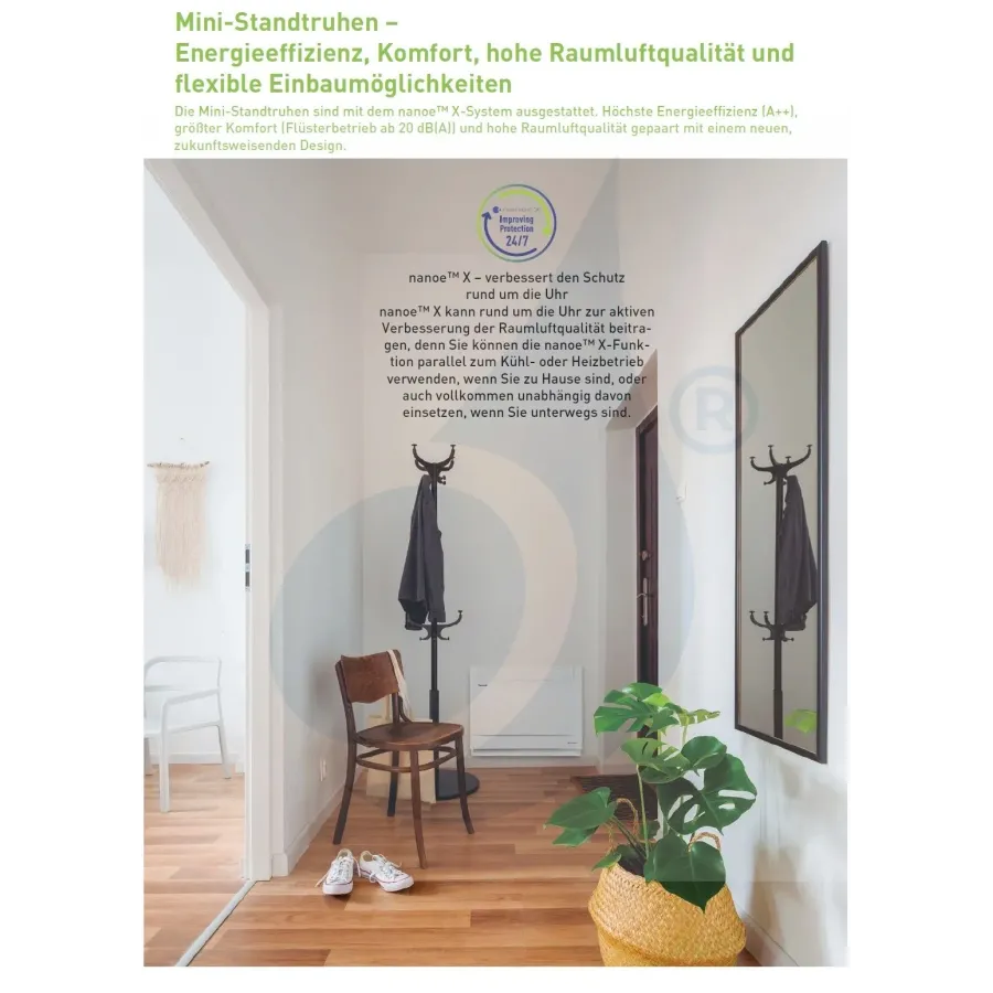 Bodenkonsole mit dem neuen Luftreinigungssystem nanoe X: Hocheffizientes A ++, Komfort (Supersilent Technology nur 20 dB (A)) bei der Kühlung und gesunde Luft in Verbindung mit modernstem Design.Der doppelte klimatisierte Luftauslass (nach oben für kalte Luft und nach unten für heiße Luft) verbessert den Komfort und macht die Umgebungstemperatur gleichmäßiger.