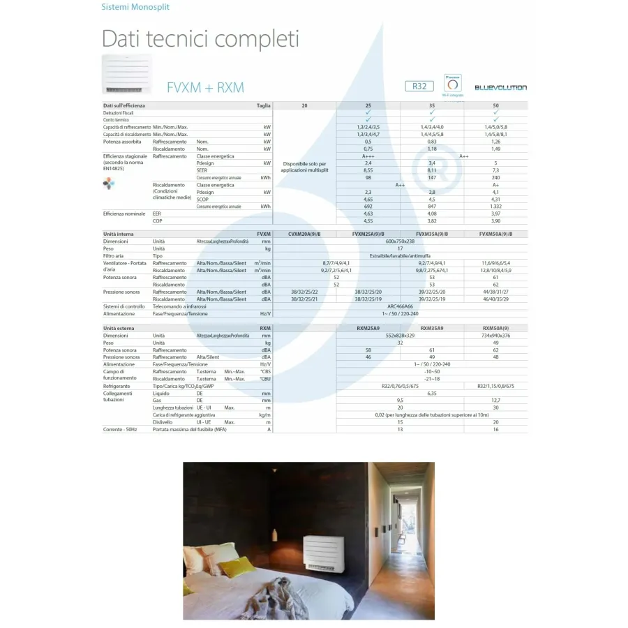Daikin Mono Split FVXM-B WiFi 12000 Btu air conditioner with low-voltage absorption heat pump, high energy class, ideal for attics or installations under windows, new underfloor heating and Heat Plus functions