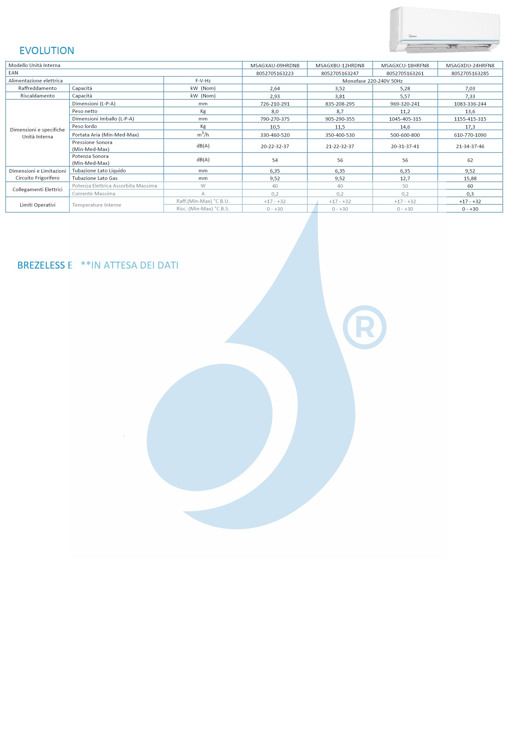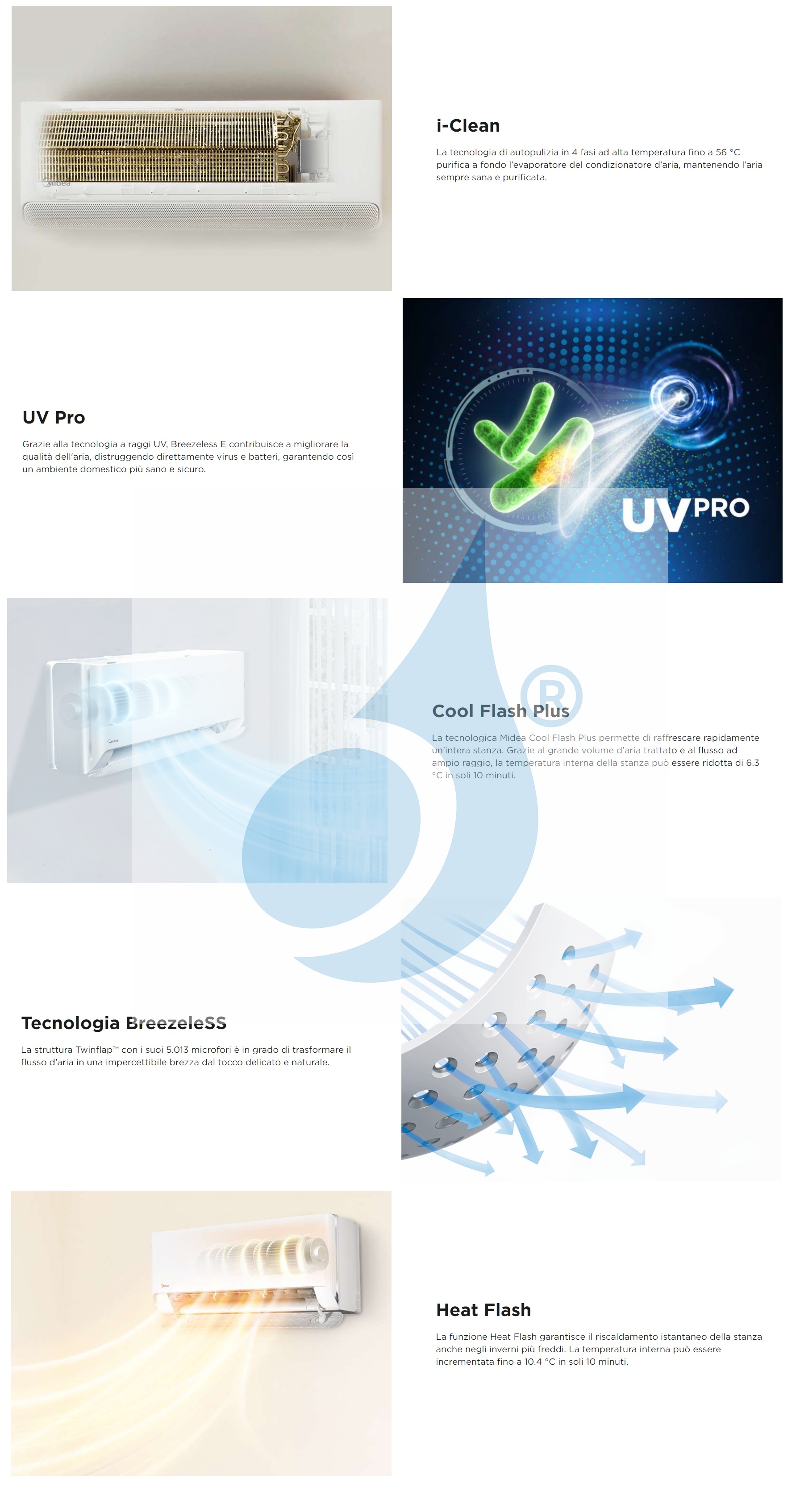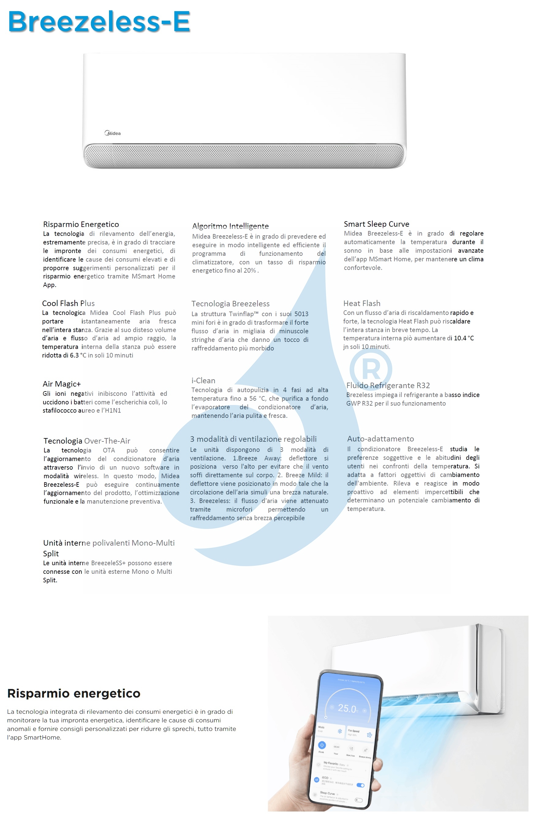 Midea Breezeless E WiFi indoor air conditioner, Breezeless E Btu, combinable with an external motor for heating functions, with a highly efficient, low-energy heat pump and dehumidifier