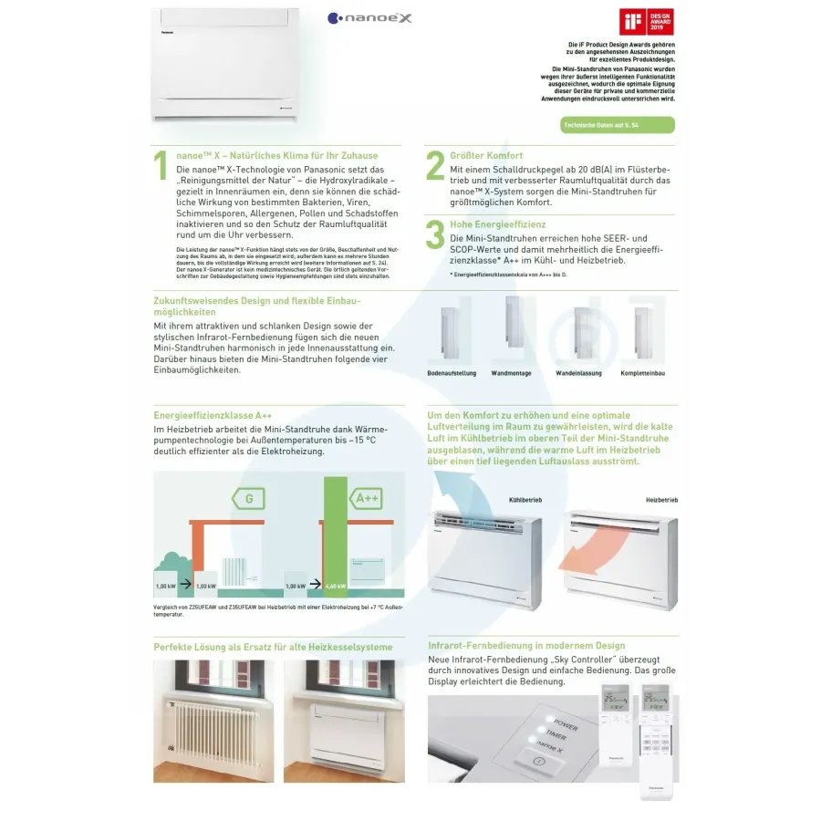 Floor console with the new nanoe X air purification system: Highly efficient A++, comfort (Supersilent Technology only 20 dB(A)) during cooling and healthy air combined with state-of-the-art design.The dual air conditioning air outlet (upwards for cold air and downwards for hot air) improves comfort and makes the ambient temperature more even.