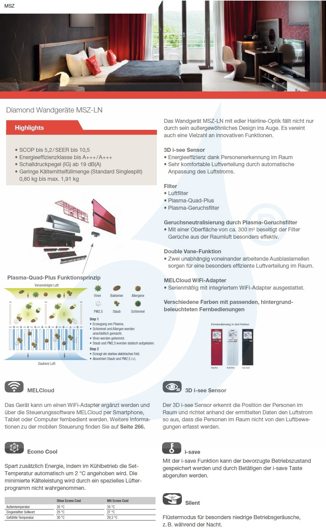 The indoor unit in the Diamond, also called MSZ-LN, is a revolutionary product with state-of-the-art technology.With this new air conditioner, Mitsubishi Electric has further developed the previous Kirigamine FH model, which is known for maximum comfort and high energy efficiency thanks to the 3D sea sensor technology.