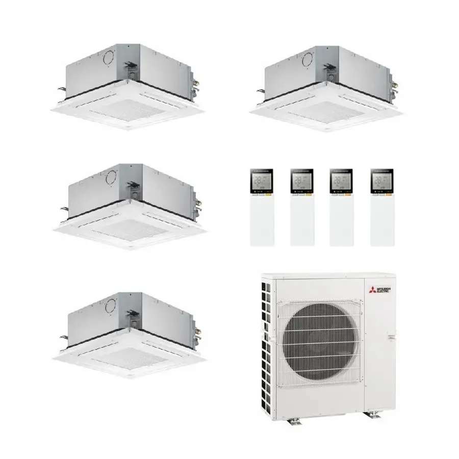 Mitsubishi Quadri Split SLZ-M Series Air Conditioners with Optional WiFi, 9000+9000+9000+12000 Btu Indoor Unit for Mitsubishi Air Conditioners, Mono Split and Multi Split Configurations with Heating and Cooling Modes. The SLZ-M series ceiling cassettes are a smart air conditioning solution for suspended ceilings with Euro grid dimensions. Meeting high demands for individual comfort and ambitious energy-saving goals, the SLZ-M 4-way ceiling cassettes offer enhanced intelligence.