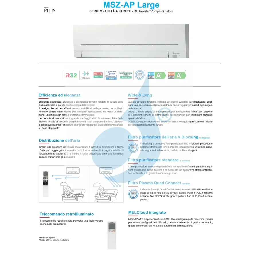 Unité de climatisation intérieure Mitsubishi MSZ-AP-Large WiFi 21000 Btu pour les configurations Mitsubishi Mono Split et Multi Split avec modes chauffage et refroidissement. Idéal pour les environnements avec une unité intérieure jusqu'à 63 m² Veuillez noter que pour que l'unité interne fonctionne, elle doit être associée à un moteur externe.