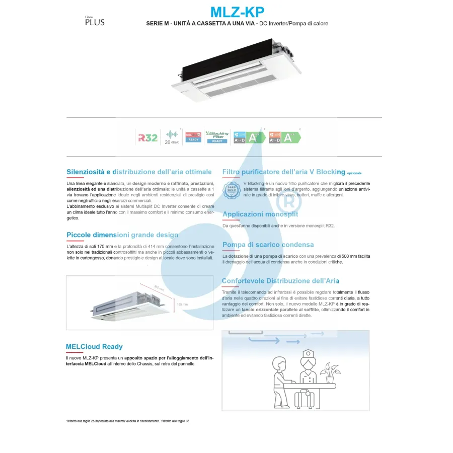 Climatiseur Mitsubishi Duo Split Series MLZ-KP avec Wi-Fi en option, unité intérieure 9000 + 9000 BTU pour climatiseurs mono-split et multi-split Mitsubishi, modes chauffage et refroidissement. Climatiseur cassette MLZ-KP à 1 sortie, idéal pour une ventilation directe ou les petits espaces confinés.