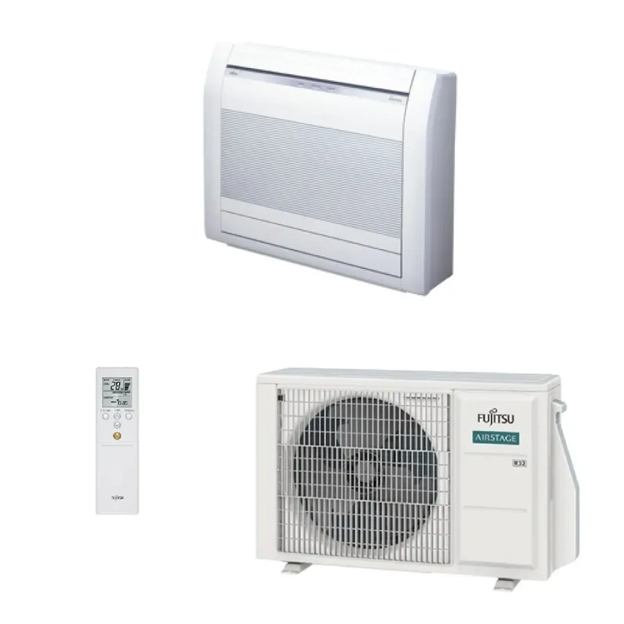 Climatiseurs de sol Fujitsu Mono Split Series KV WiFi en option, pompe à chaleur de 14 000 BTU avec technologie Inverter basse consommation, idéale pour les combles ou les installations sous les fenêtres, chauffage optimal grâce à sa position au niveau du sol.