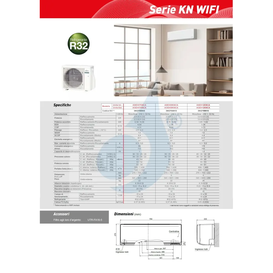 Climatiseur Fujitsu Mono Split KN Series WiFi 7000 BTU avec pompe à chaleur, faible consommation d'énergie et technologie Inverter