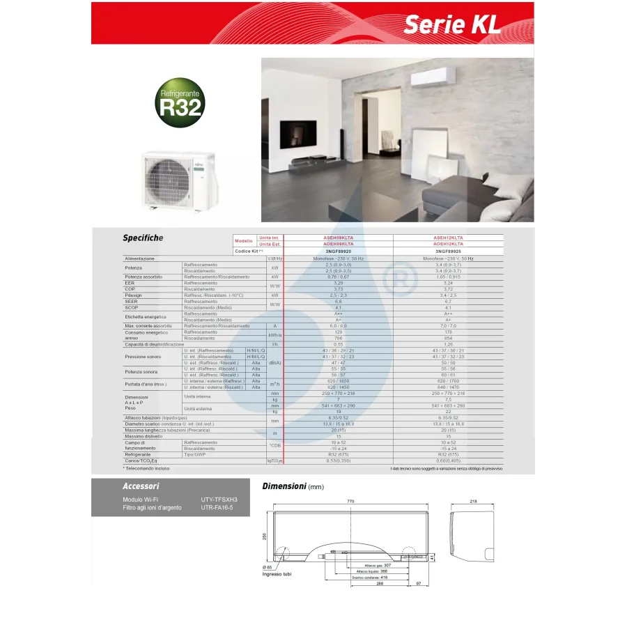 Fujitsu Mono Split KL-serie airconditioners met optionele wifi, 12.000 Btu verwarming met energiezuinige warmtepomp, invertertechnologie