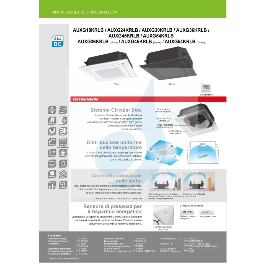 Binnenunit AUXG45KRLB 45000 Btu Buitenunit AOEG45KBTB 45000 Btu De meest complete oplossing voor het koelen van uw woning: maximaal vijf onafhankelijke ruimtes met vele variaties en oplossingen.90x90 KR circulaire flowcassette-eenheid