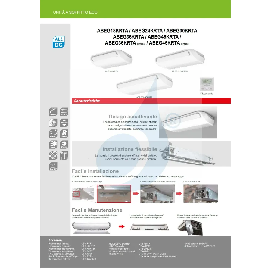 Binnenunit ABEG36KRTA 36000 Btu Buitenunit AOEG36KQTA 36000 Btu De meest complete oplossing voor het koelen van uw woning: maximaal vijf onafhankelijke ruimtes met vele variaties en oplossingen.Eco KR plafondserie