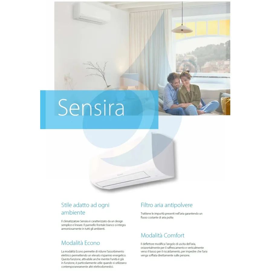 Daikin Mono Split Sensira-serie airconditioner met optionele WiFi, 9000 Btu verwarming met laagspanningsabsorptiewarmtepomp in hoge energieklasse, luchtontvochtigingsfunctie, luchtreiniging met eliminatie van virussen en bacteriën