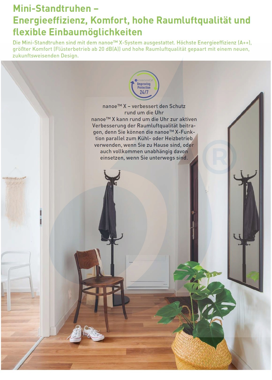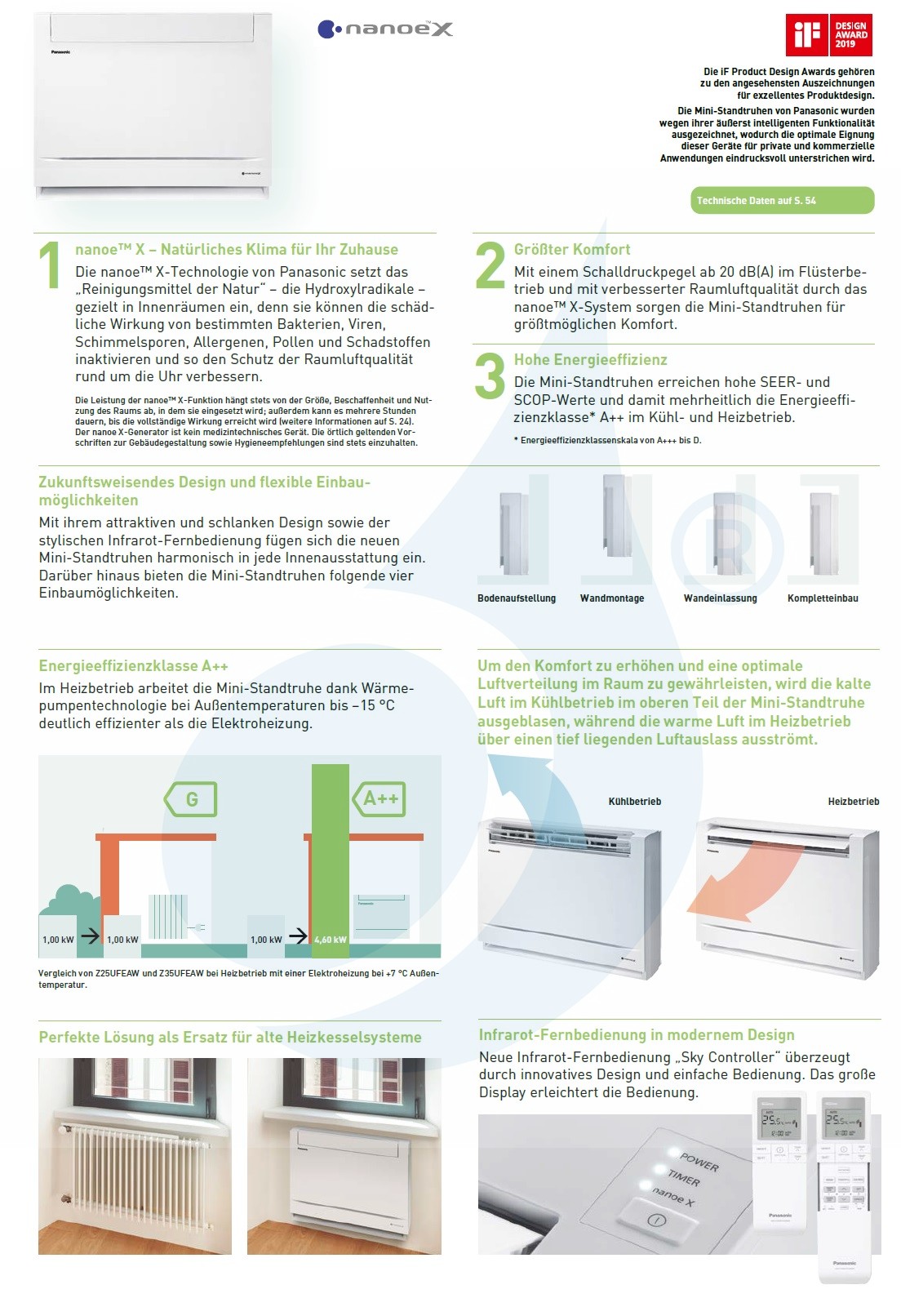 Vloerconsole met het nieuwe nanoe X luchtreinigingssysteem: Hoog rendement A++, comfort (Supersilent Technology slechts 20 dB(A)) tijdens het koelen en gezonde lucht gecombineerd met state-of-the-art design.De dubbele luchtuitlaat van de airconditioning (omhoog voor koude lucht en omlaag voor warme lucht) verhoogt het comfort en zorgt voor een gelijkmatigere omgevingstemperatuur.